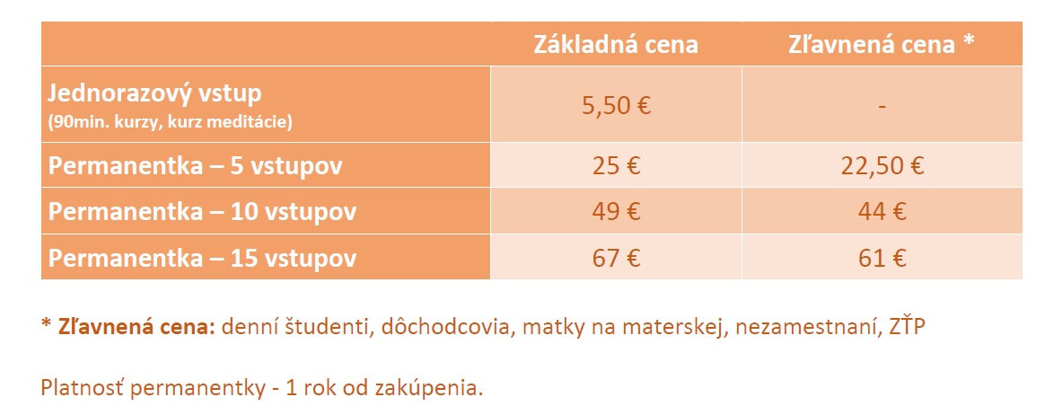 - platba za jednotlivé cvičenia (nie za kurz) odpočítaním vstupu z permanentky (permanentku je možné zakúpiť si aj online kliknutím na "Permanentka" v pravom hornom rohu tabuľky s rozpisom kurzov)